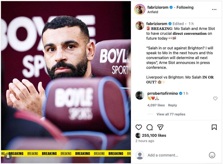 As part of his mixed-zone tirade, Salah said there is "no relationship" between him and Slot, while the latter also admitted he does not know if the forward will play for the club again. With both parties seemingly willing to now come to the table, Firmino reacted favourably to the news.