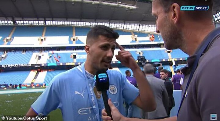 Asked how City remain so hungry for success, Rodri told Optus Sport: 'To be honest, I think it's in here [points to his head]. It's the mentality.