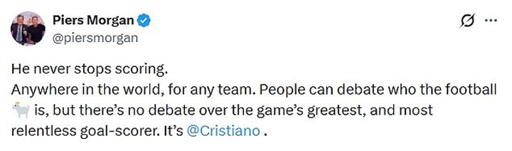 One of his most staunch supporters, Piers Morgan, took to social media in the wake of Ronaldo's double to declare him the game's greatest goalscorer of all time.