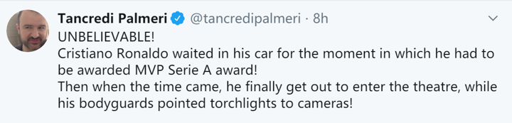 Cristiano Ronaldo caused controversy at the Serie A awards night - by reportedly staying in his car until he was announced as the winner of the MVP award.