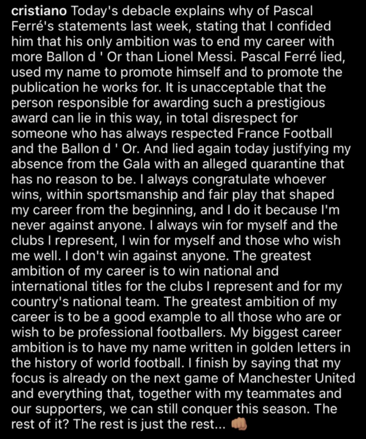 Cristiano Ronaldo, who was absent from the 2021 Ballon d'Or ceremony, has now broken his silence on social media, clearing the air surrounding the claim.