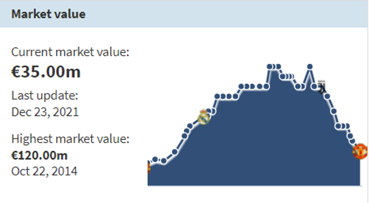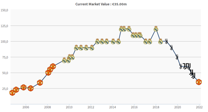 according to data provided by Transfermarkt, Ronaldo's market value drops to an astonishing €35m - it is the lowest since 2008.