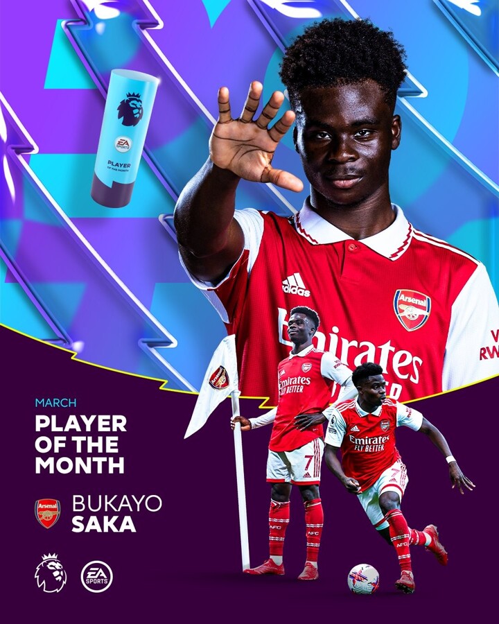 Arsenal tweeted their congratulations to the 21-year-old star, who has played a key role for the Gunners in their quest for Premier League glory. Arsenal won all four of their league games in March, with Saka scoring three goals for Mikel Arteta's side.