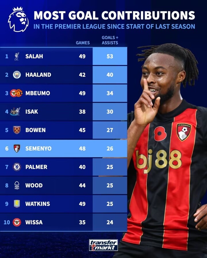 Transfermarkt has compiled a ranking of Premier League players this season based on their goal involvement percentage relative to their team's total goals. Erling Haaland tops the list with 65%, while Bournemouth forward Semenyo occupies second place, who also ranks sixth in Premier League goal involvement since last season.