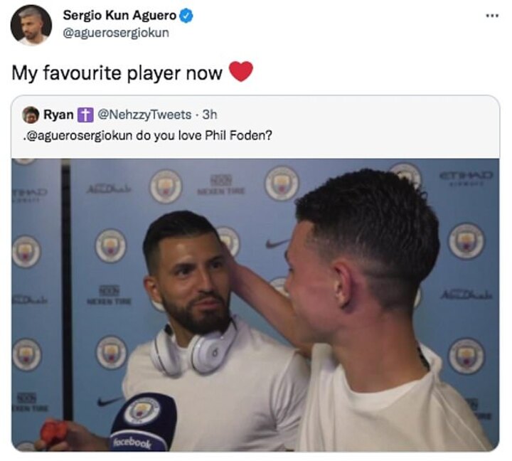 Sergio Aguero has named former Manchester City team-mate Phil Foden as his favourite player at the moment in a Twitter Q&A on Tuesday.