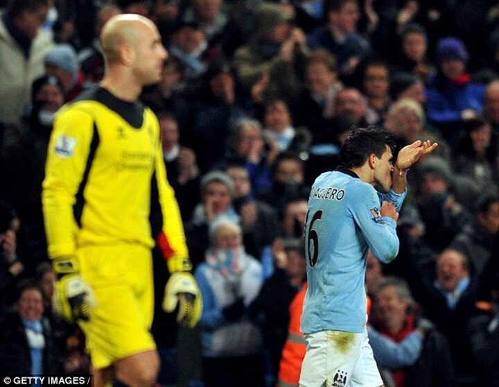 Aguero took a touch with his thigh, taking the ball even further away from goal before squeezing home a right-footed effort just inside the far post to leave Liverpool's defence stunned and Reina with egg on his face.