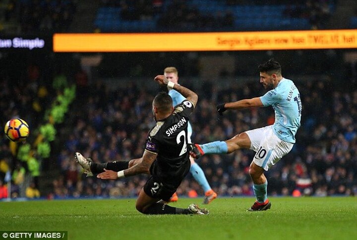 Heaton picked himself up and dived at Aguero's feet but the striker still managed to rifle home with his right foot from an impossible angle despite two Burnley defenders positioning themselves on the goal-line.