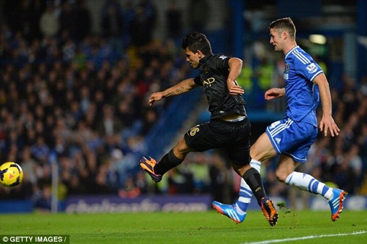 Against Chelsea at Stamford Bridge, with City 1-0 down, Aguero demonstrated brilliant awareness by timing his run perfectly in behind Gary Cahill and John Terry to latch onto Javi Garcia's through-ball.