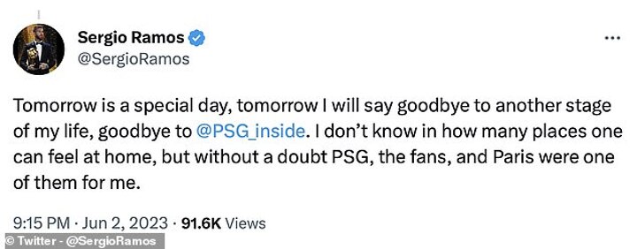 PSG themselves posted a thank you message on the club's Twitter account, which said: 'Paris Saint-Germain is delighted to have seen @SergioRamos defend our colors with such determination and sincerely wishes him the best for the rest of his career.'