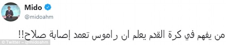 Tweeting in Arabic, Mido — who played for Tottenham, West Ham, Middlesbrough and Wigan during his playing career — wrote: 'Anyone that understands football would know that Ramos injured Salah intentionally.'