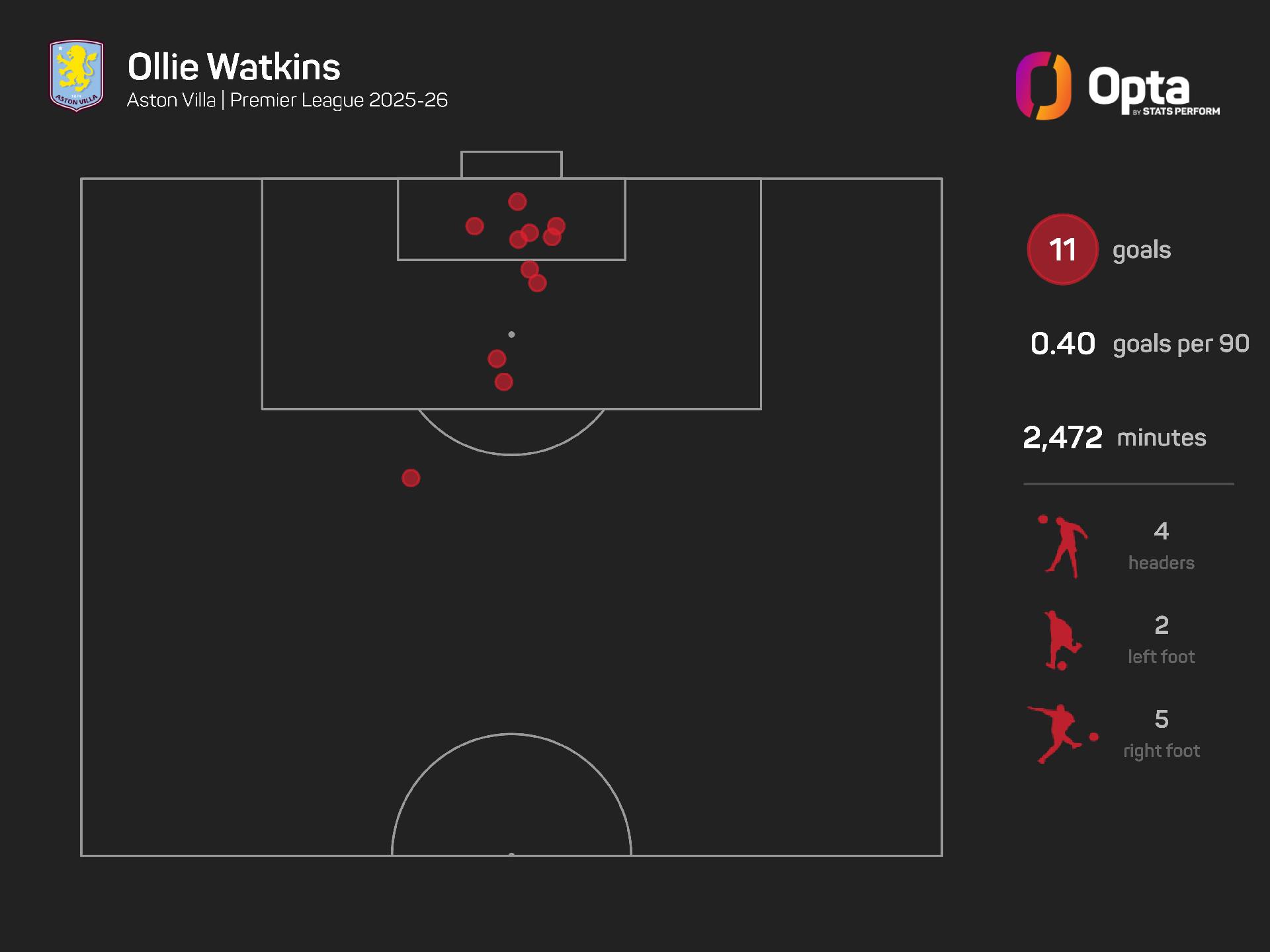 Watkins is hitting form at the right time and has now scored 10+ goals in all six of his Premier League seasons (11 this term).