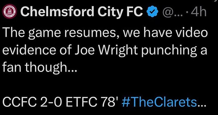 Chelmsford City FC, who went on to win the game 3-0, wrote: 'We have video evidence of Joe Wright punching a fan,' in a now-deleted post.
