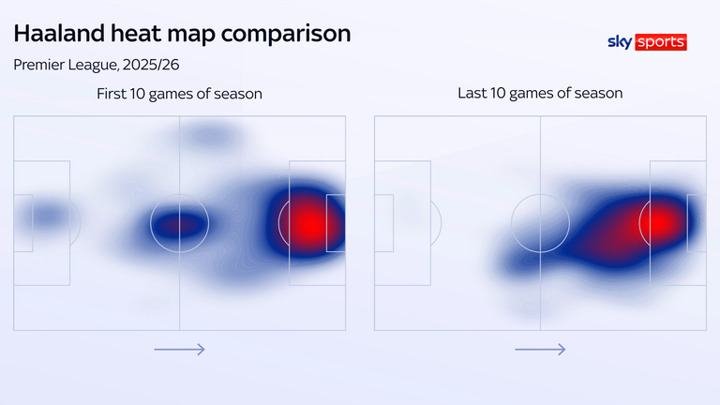 Why, then, have his goalscoring numbers dropped off a cliff since the turn of the year, with 25 goals between August and December and only five so far in 2026? At this same point in 2025 Haaland had already scored 11 times. Is he the problem?