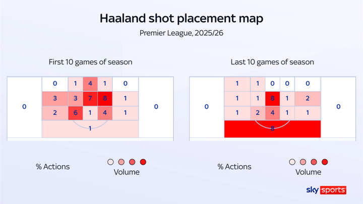 Fatigue, niggles, and the quality and form of opposition in recent outings no doubt has a part to play. So too the quality of chances Haaland is being fed. Of the 15 shots he has managed inside the box since matchweek 22, only 33 per cent have been deemed 'big chances'.