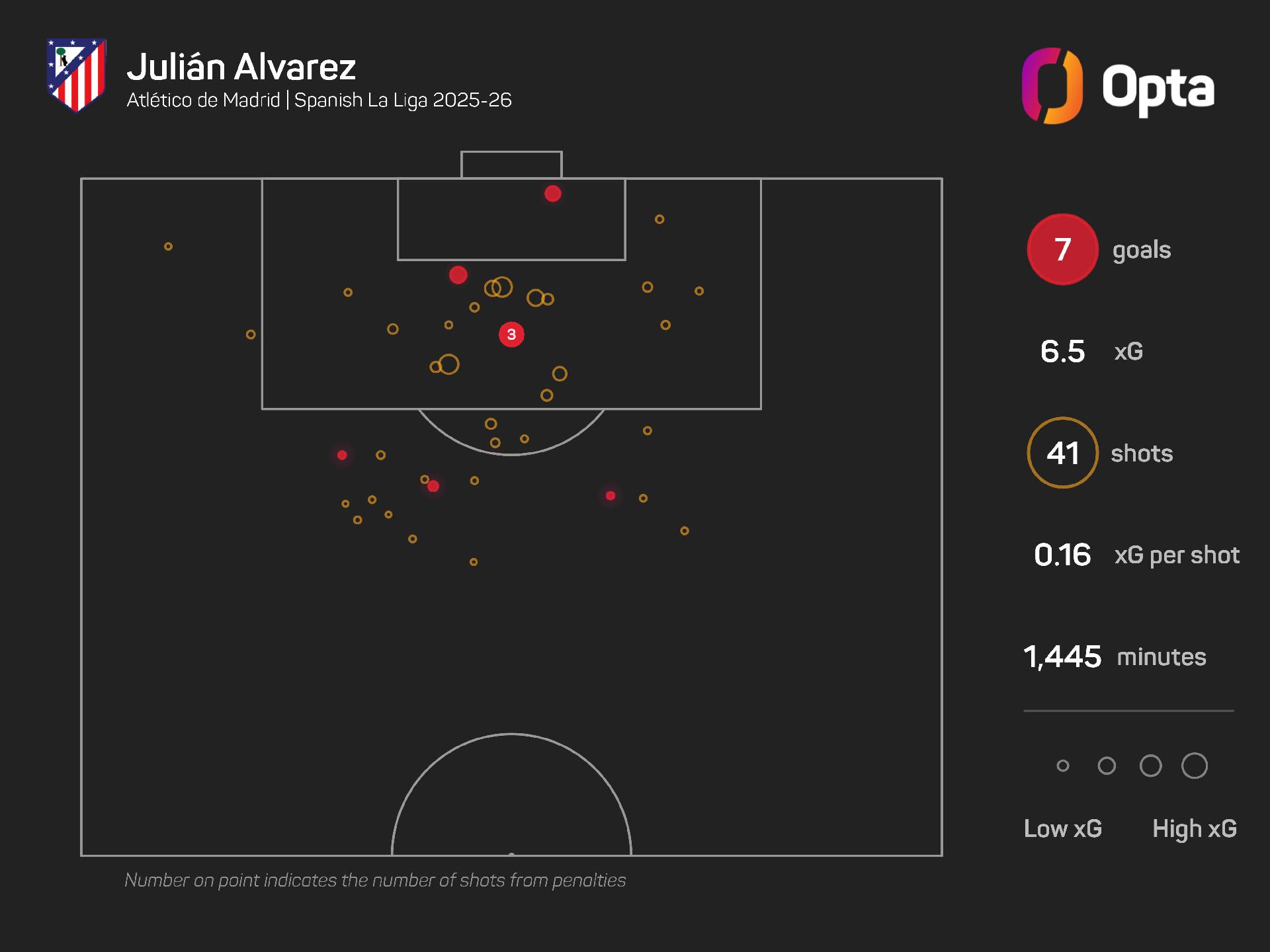 Alvarez has not scored in any of his last nine LaLiga games, his longest run without a goal in the league since April 2024, when he went 10 matches without scoring for Manchester City in the Premier League.