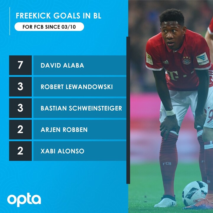 On March 6th, 2010, Alaba made his Bundesliga debut. Since then, he has scored 7 direct free-kick goals in the campaign, more than any other teammates.