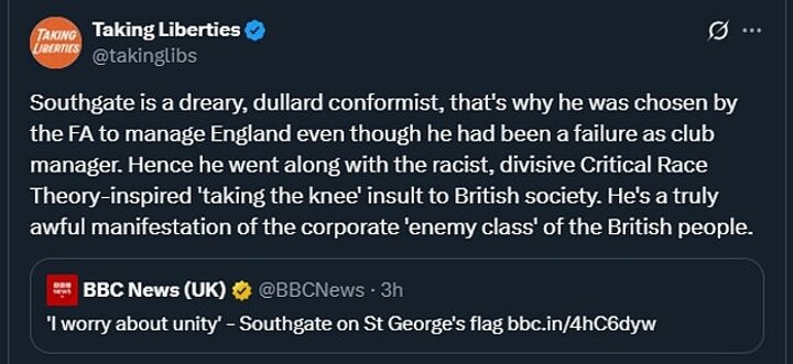 'Hence he went along with the racist, divisive Critical Race Theory-inspired 'taking the knee' insult to British society. He's a truly awful manifestation of the corporate 'enemy class' of the British people.'