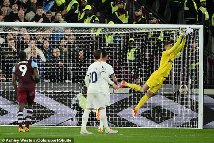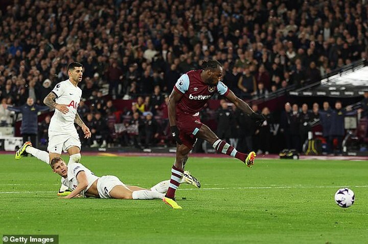 Antonio found himself with only Vicario to beat. He aimed low with power but did not connect sweetly and enabled the Spurs goalkeeper to keep it out, a splendid save but one he should not really have been able to make.