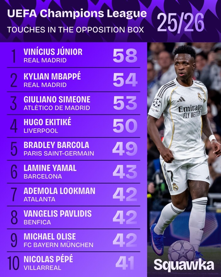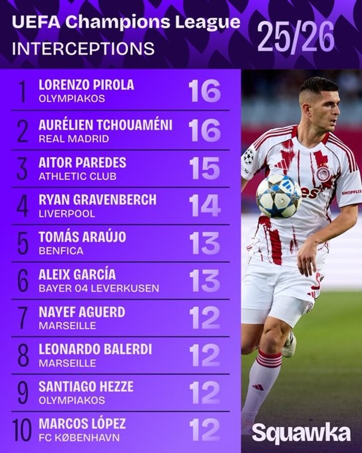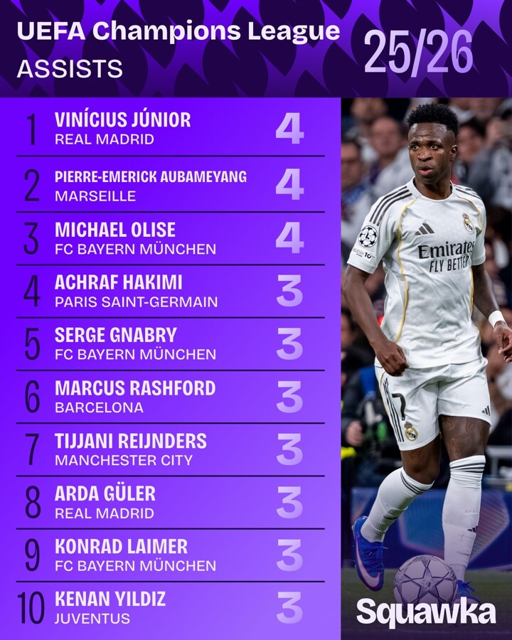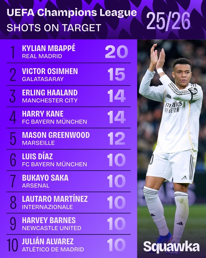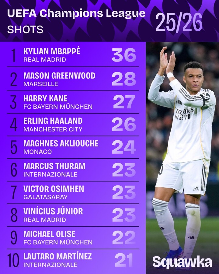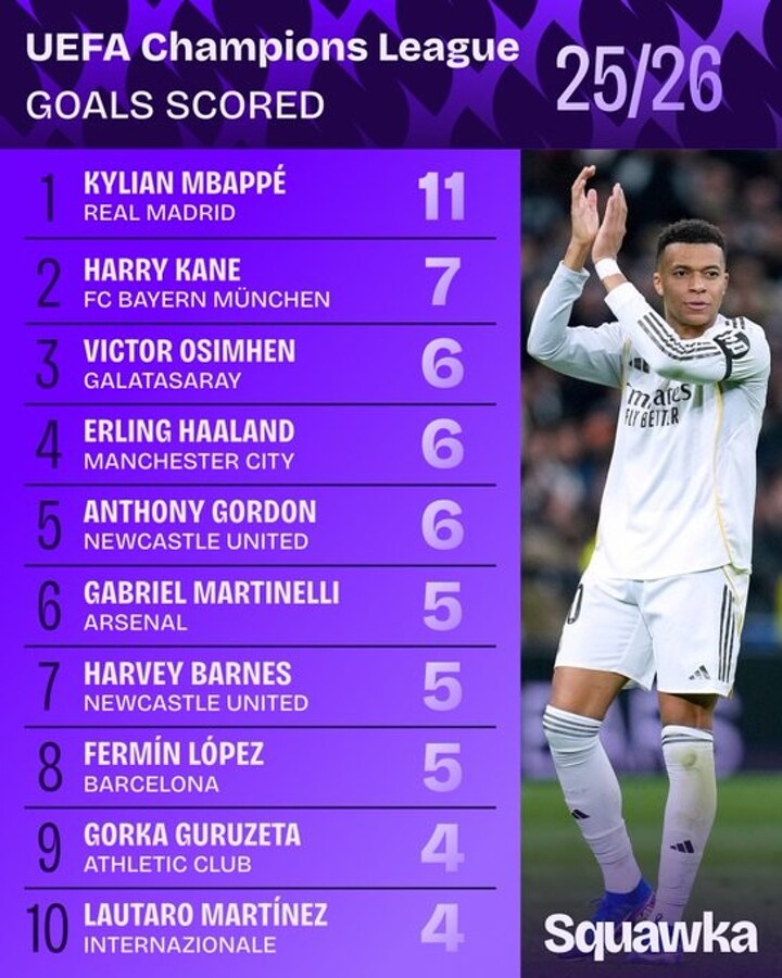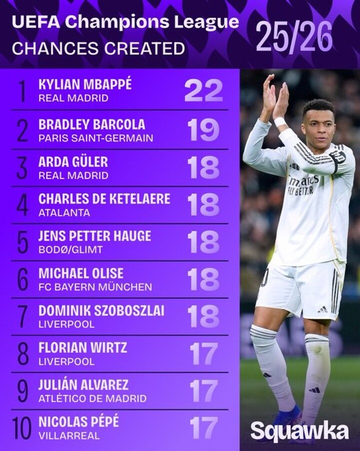 Squawka lists UCL statistics: Mbappe ranks first in multiple statistics
