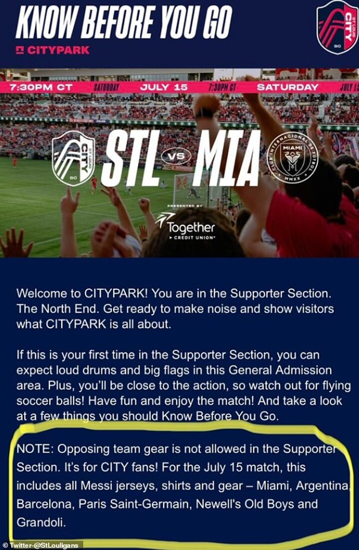 His new squad visited St. Louis City on Saturday - losing 3-0 - and a memo sent to fans beforehand revealed that the club warned fans in the Supporters Section not to wear Messi jerseys.