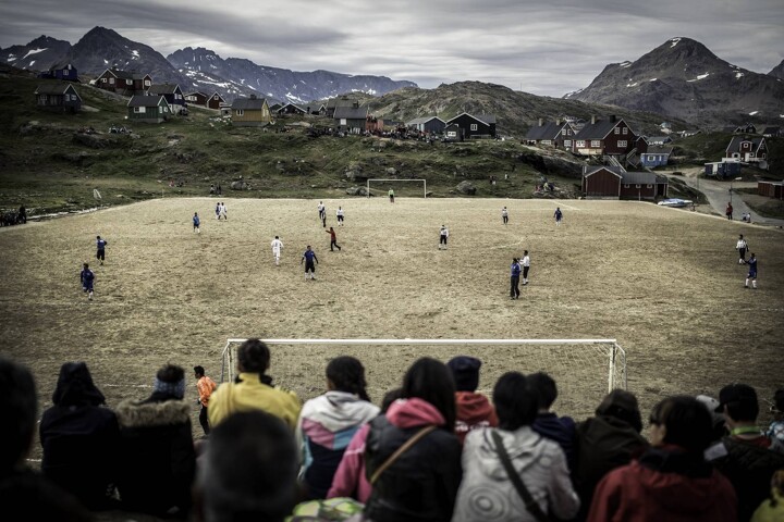 A football match takes place in Tasiilaq, Greenland, on a pitch surrounded by stunning scenery including deep blue iceberg-peppered water and snow-capped peaks