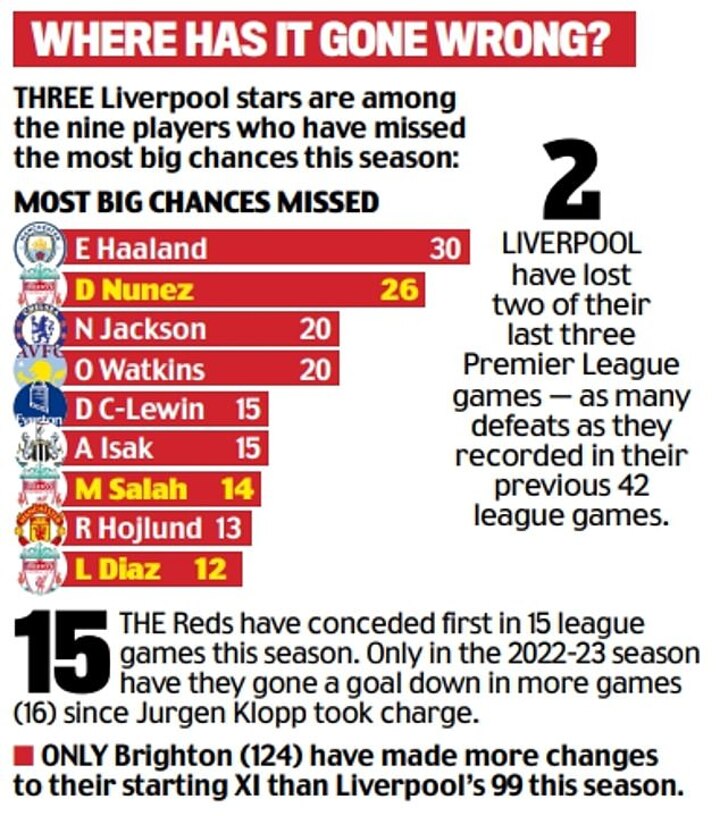 Only in the 2023-24 season have they gone a goal behind opposition teams in the Premier League in more games (16) since Klopp took charge back in 2015.