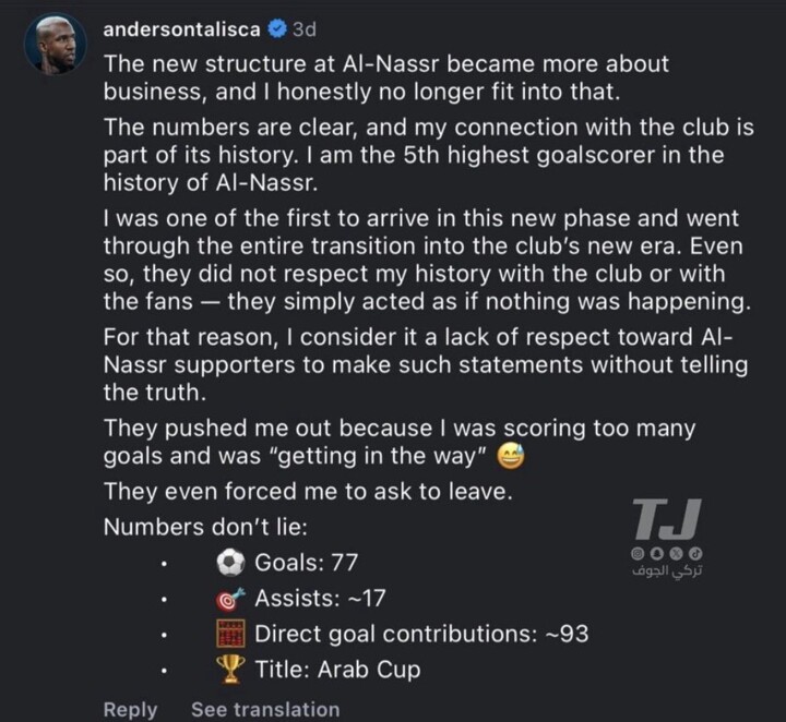“The new structure at Al-Nassr became more about business, and I honestly no longer fit into that. The numbers are clear, and my connection with the club is part of its history. I am the 5th highest goalscorer in the history of Al-Nassr. I was the first to arrive in this new phase and went through the entire transition into the club's new era. Even so, they did not respect my history with the club or with the fans--they simply acted as if nothing was happening. For that reason, I consider it a lack of respect toward Al-Nassr supporters to make such statements without telling the truth. They pushed me out because I was scoring too many goals and was "getting in the way". They even forced me to ask to leave. Numbers don't lie, I scored 77 goals, 17 assists, 93(actually it's 94) direct goal contributions, win the Arab Cup.”