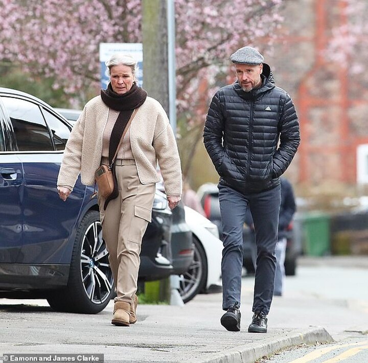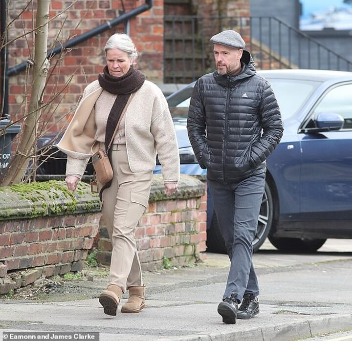 Ten Hag headed to Junipers, in Hale, for lunch - where both he and his wife sported casual outfits as they headed into town.