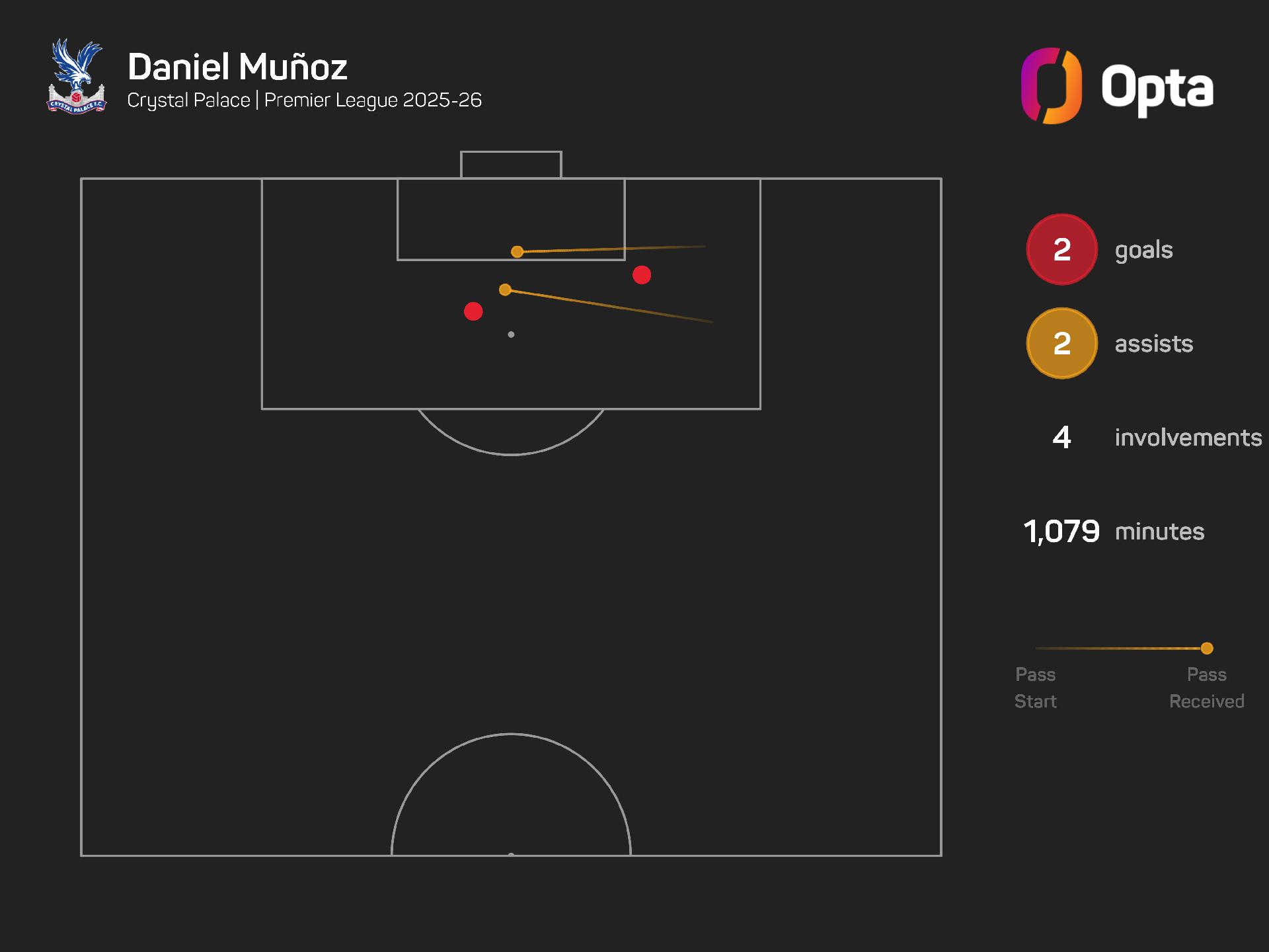 No defender has more goal involvements in the Premier League this season than Daniel Munoz (two goals, two assists).