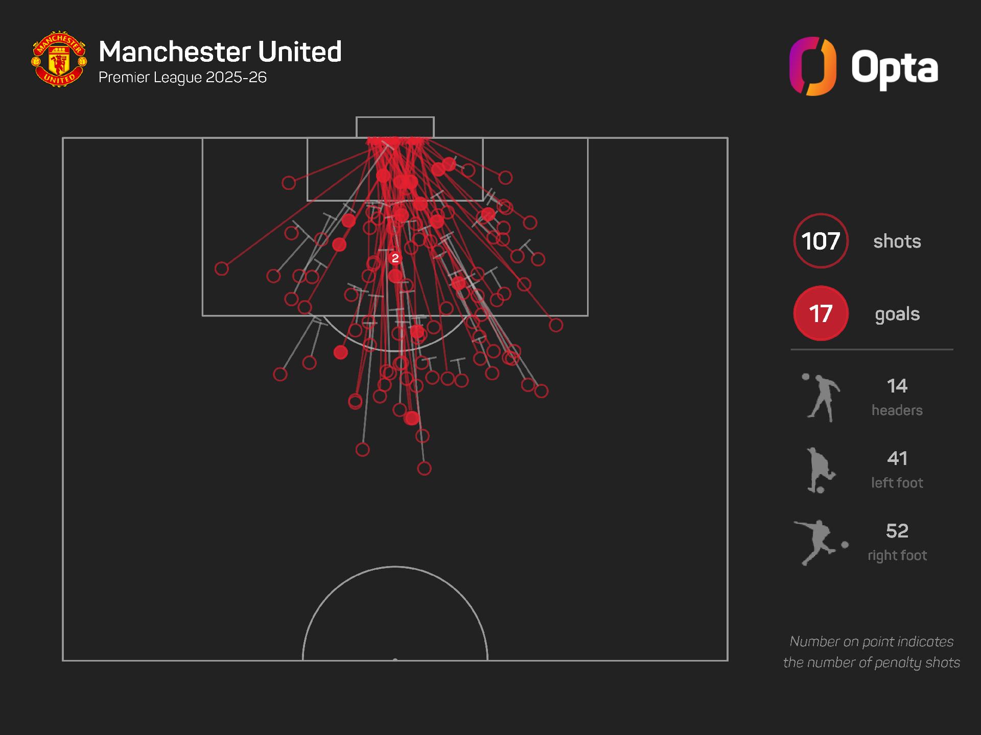 Only Liverpool (184) have managed more attempts than United's 183 this season. Of those, 62 have hit the target; Chelsea (67) are the sole team to have done so more often, though the Blues have scored four more goals.