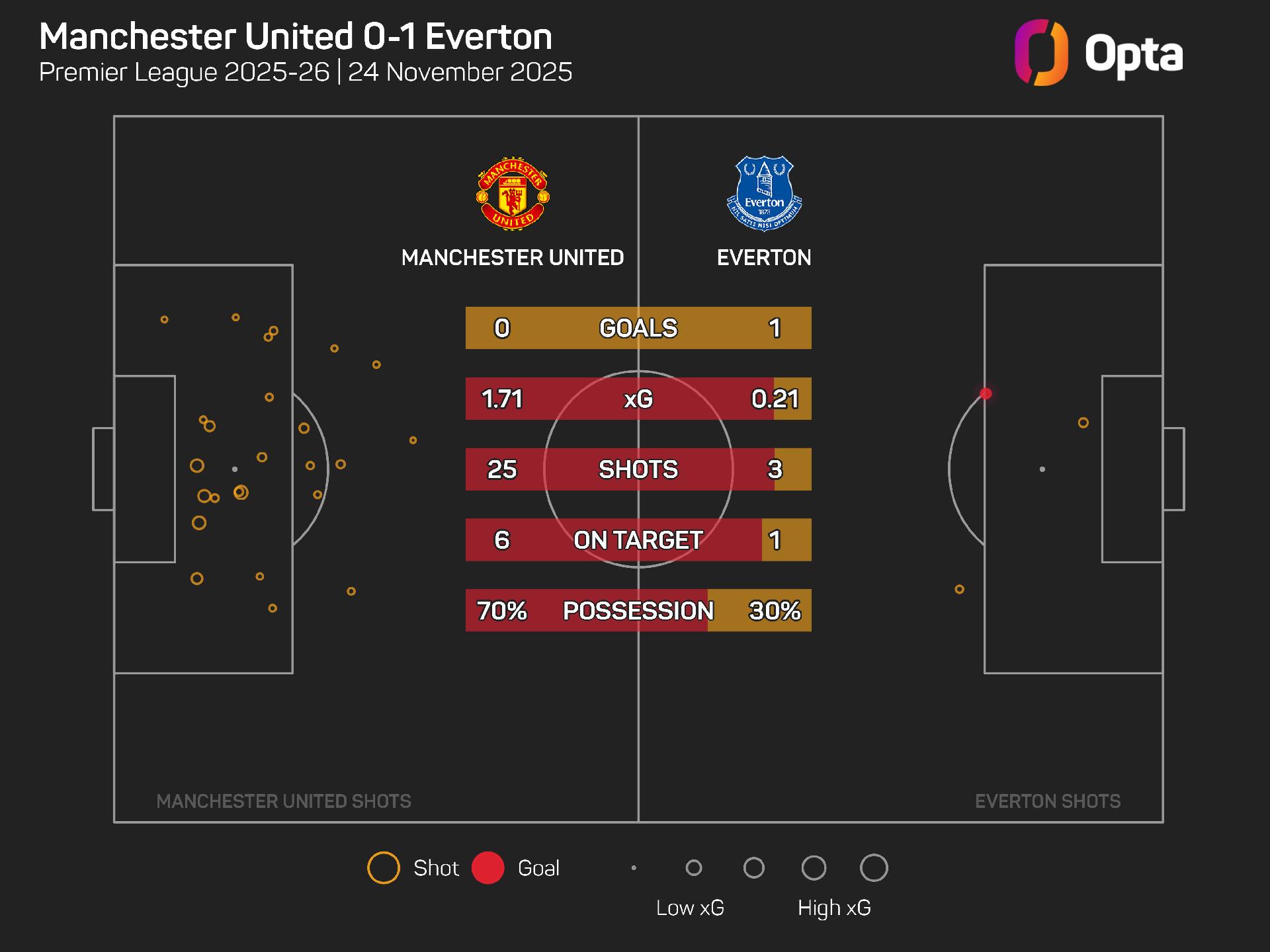 Amorim's side ended that game with 25 shots (six on target) as they failed to find a way past an inspired Jordan Pickford and stoic Everton defence, while they conceded from the only effort on target they faced at the other end.