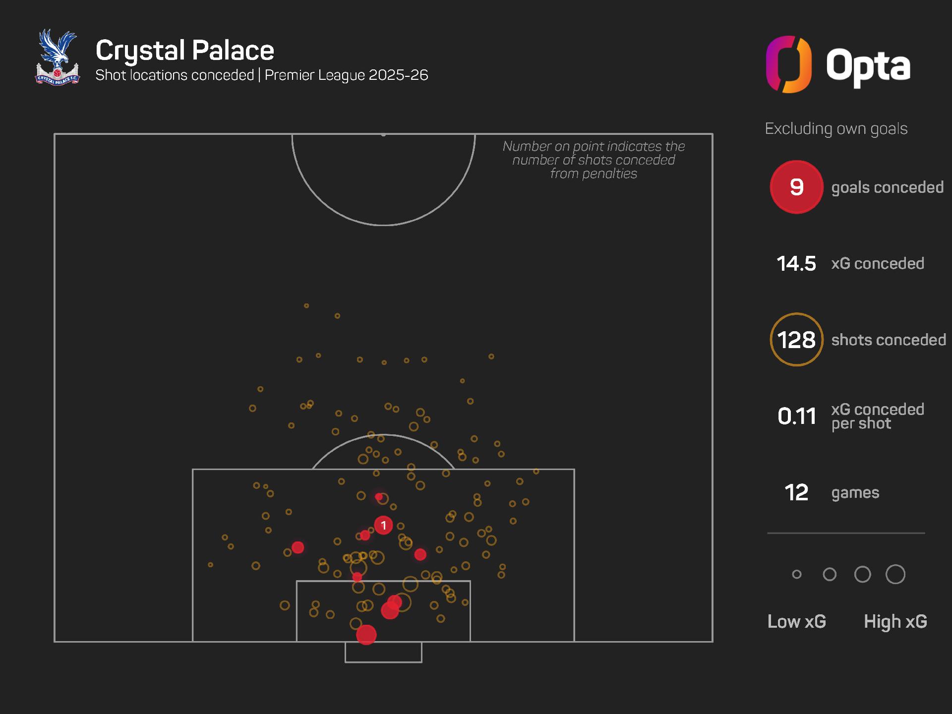 They have faced 14.5 expected goals against (xGA) from the 128 shots they have faced, though only 36 of those have been on target. Palace have also kept six clean sheets, with only Arsenal (seven) enjoying more shutouts.