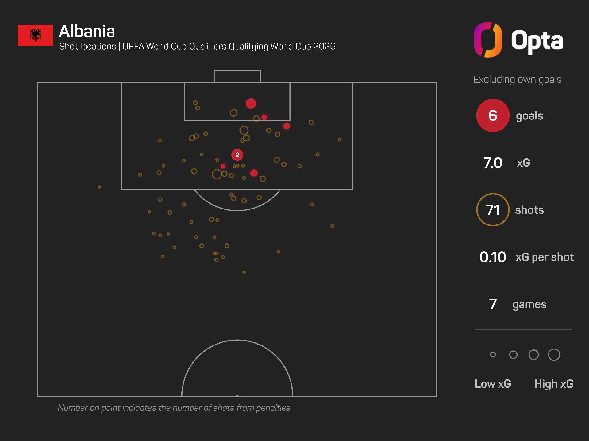 Overall, they have netted seven goals from their 71 shots (worth 7.0 expected goals). Albania have only scored more than once in one of their games – a 3-0 win over Andorra at home – with Rey Manaj their top scorer on three goals.