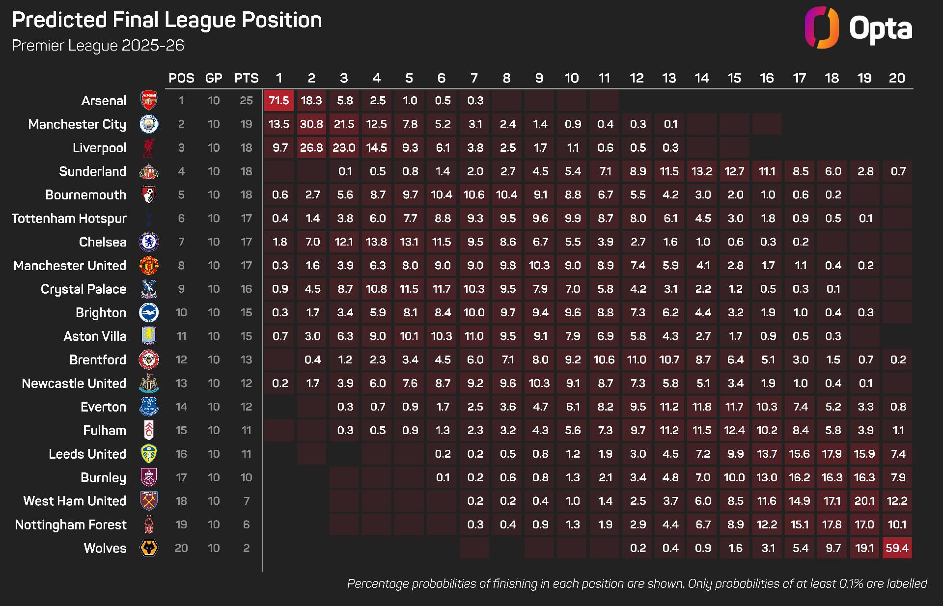 But it is Arsenal that are huge favourites to claim the crown, doing so in 71.5% of season simulations. City top the pile in 13.5% and Liverpool do so in 9.7%.