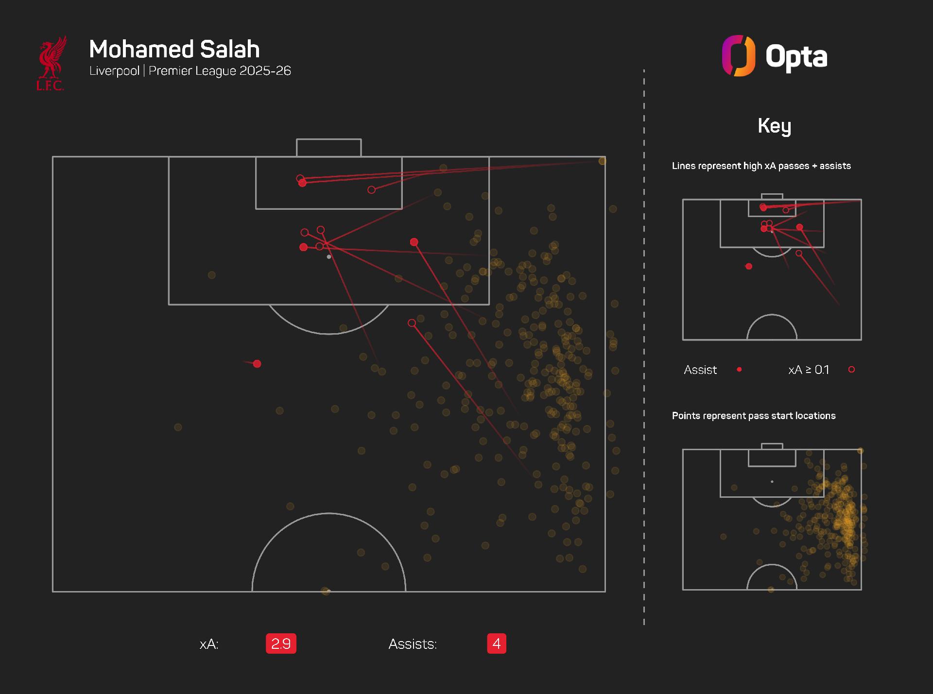 The Egyptian has four assists to his name in the league this term, more than any other Liverpool player, despite having the fourth-most expected assists (2.9 xA) and the third-most chances created (35).