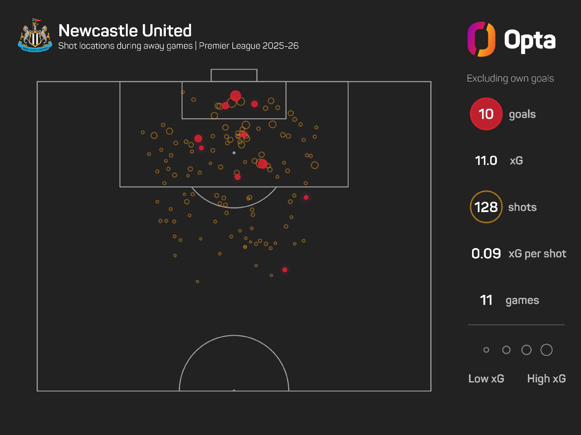 On the road, they have had 128 shots worth 11.0 xG, so Newcastle are massively underperforming in front of goal.