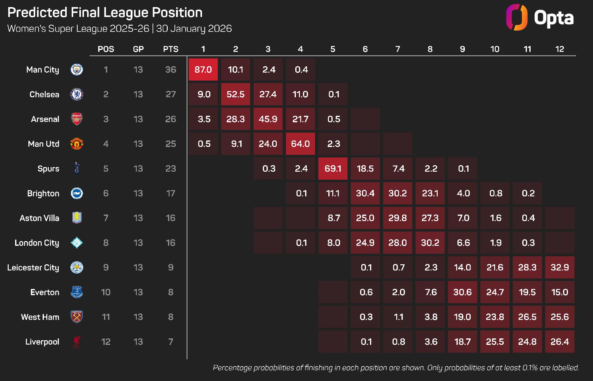 They go into this weekend's clash with an 87% chance of clinching the WSL title, according to the supercomputer, with Chelsea’s hopes sitting at just 9%.