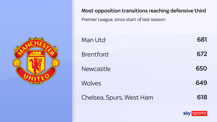 Since the start of last season, only three Premier League sides - Everton, Bournemouth and Tottenham - have given up more transition opportunities. It speaks to United's openness that they are top for opposition transitions reaching their defensive third.