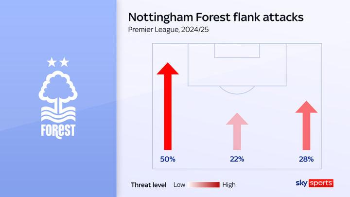 Nuno is seeking maximising his threat this season, with Forest directing a whopping 50 per cent of their attacks down their left flank, compared to 28 per cent down their right and 22 per cent through the middle. According to Opta, it is the highest proportion by any Premier League side.