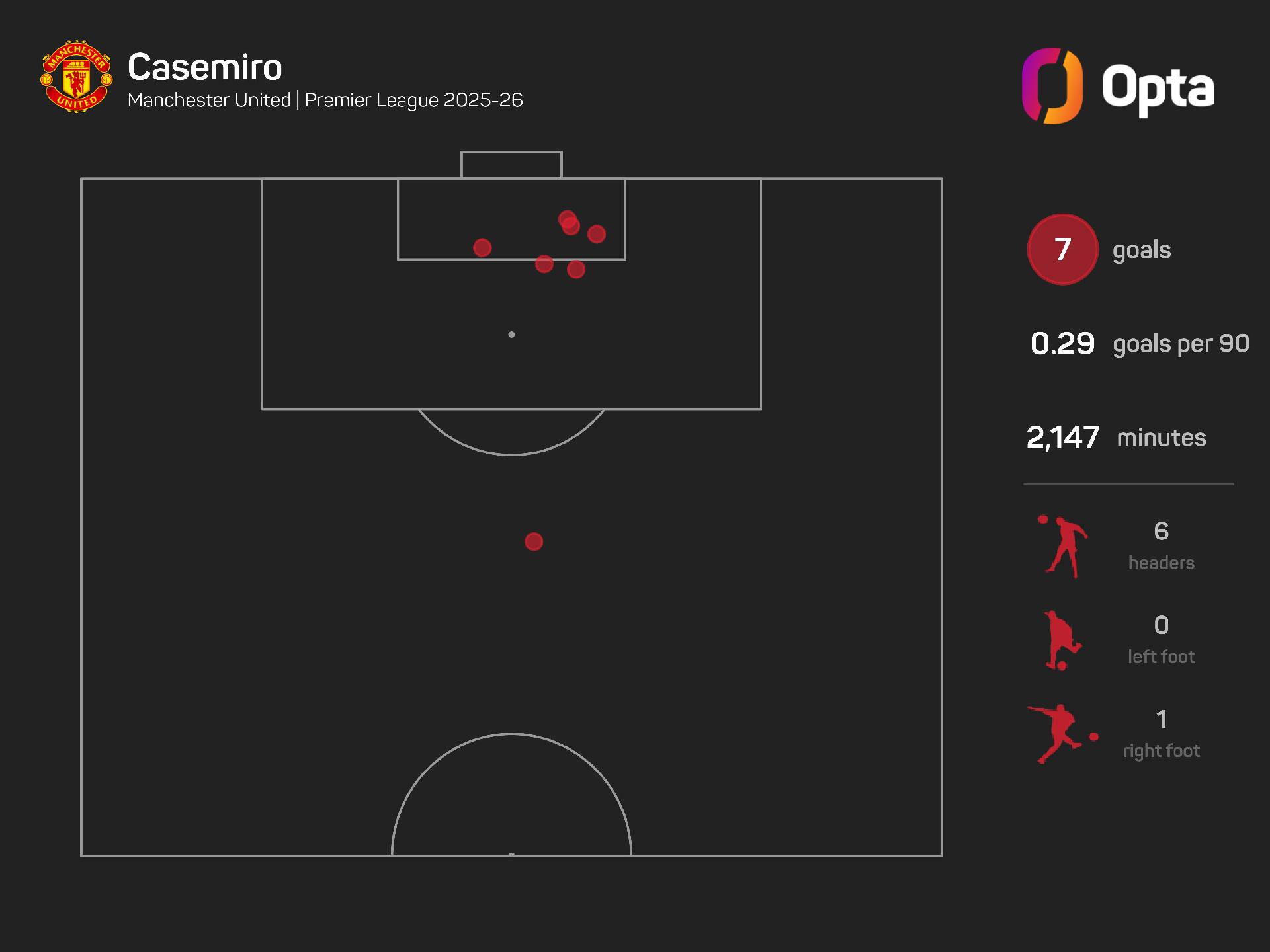 Six of his goals have come from non-penalty set-pieces, the most by a United player in a single top-flight campaign since Wayne Rooney in 2011-12 (seven).