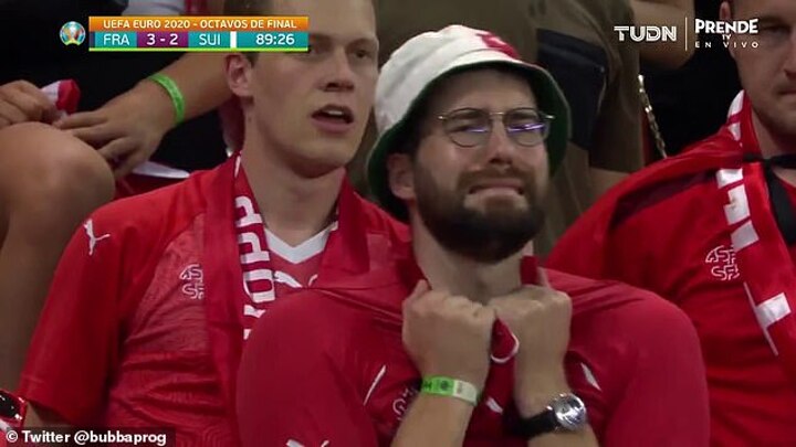 France were leading 3-2 heading into stoppage-time during the all-time classic clash on Monday, and one of the cameras managed to pick out Loutenbach - who was wearing a bucket hat and clawing at his top - in the crowd.