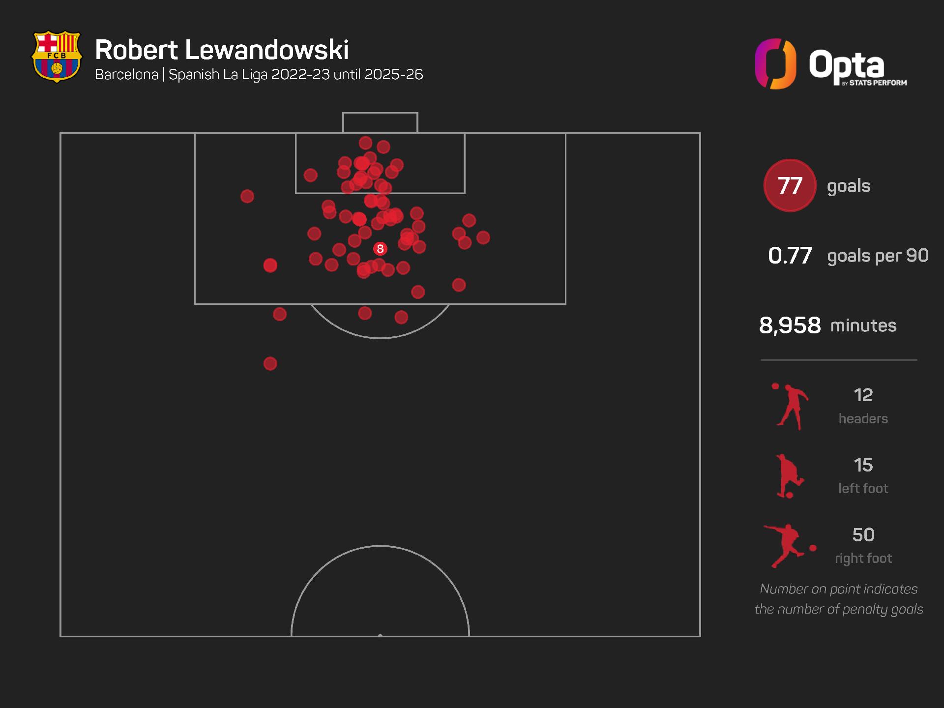 The Poland captain has registered 95 goal contributions (77 goals, 18 assists) in 116 LaLiga appearances, more than any other player in the division since he joined the club.