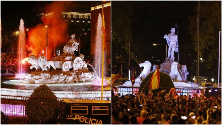 The fountains of Cibeles and Neptuno are located just a few 100 metres from each other in the centre of Madrid and it is at these fountains that Real Madrid and Atletico Madrid traditionally celebrate their titles.