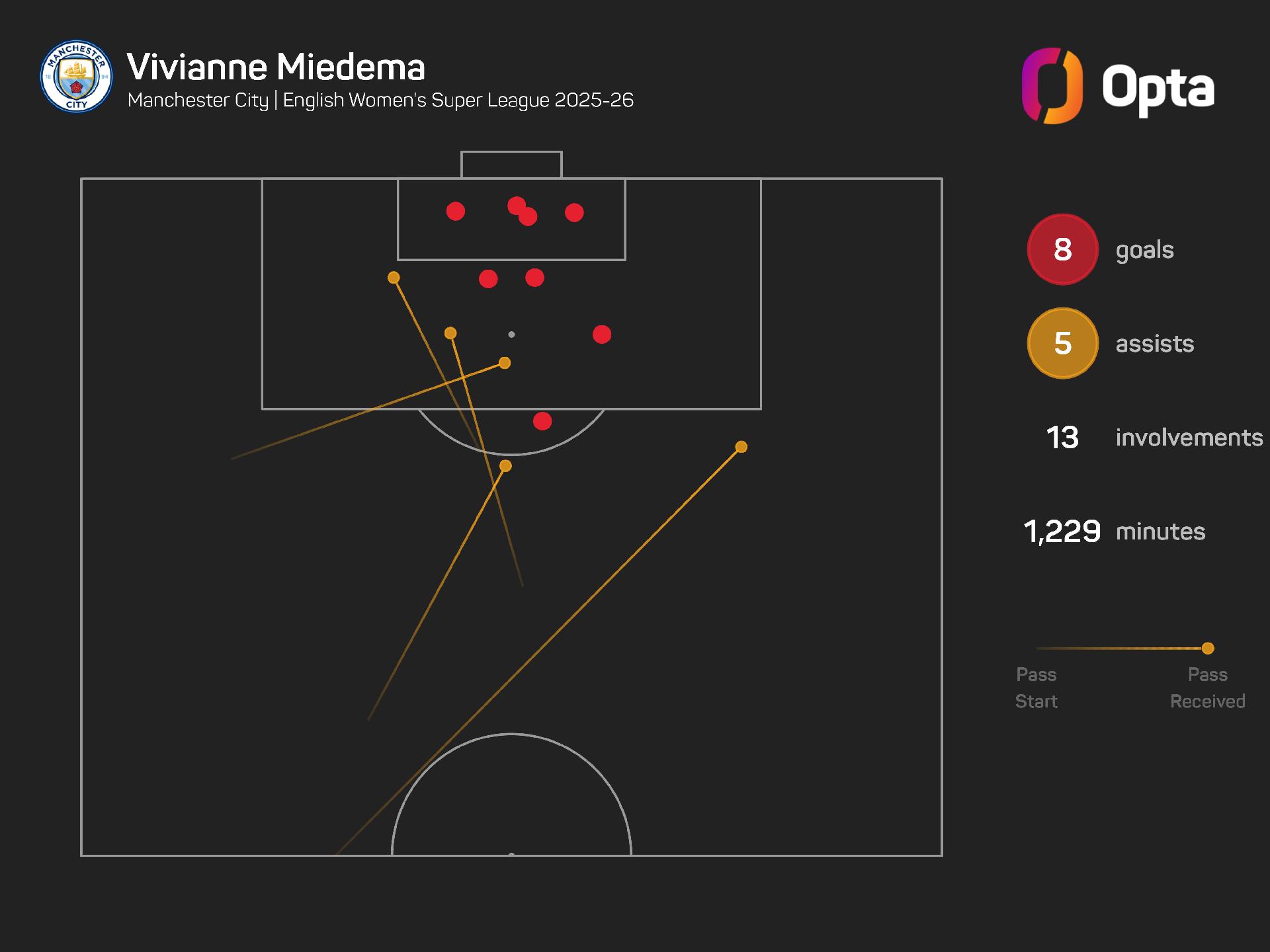 She has also scored the second-most goals for City in the WSL this term (eight, behind Khadija Shaw's 15), while also providing five assists from 29 chances created.