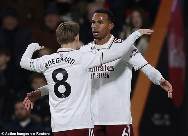 Arteta said: ‘I really love today the next step of the team in terms of individual personality and presence. I think what Gabi Magalhaes has done after making a big mistake to concede the goal, the way he reacted to that, the way he played afterwards, the way he transmitted energy after that, it was remarkable. And Declan (Rice), another one.’