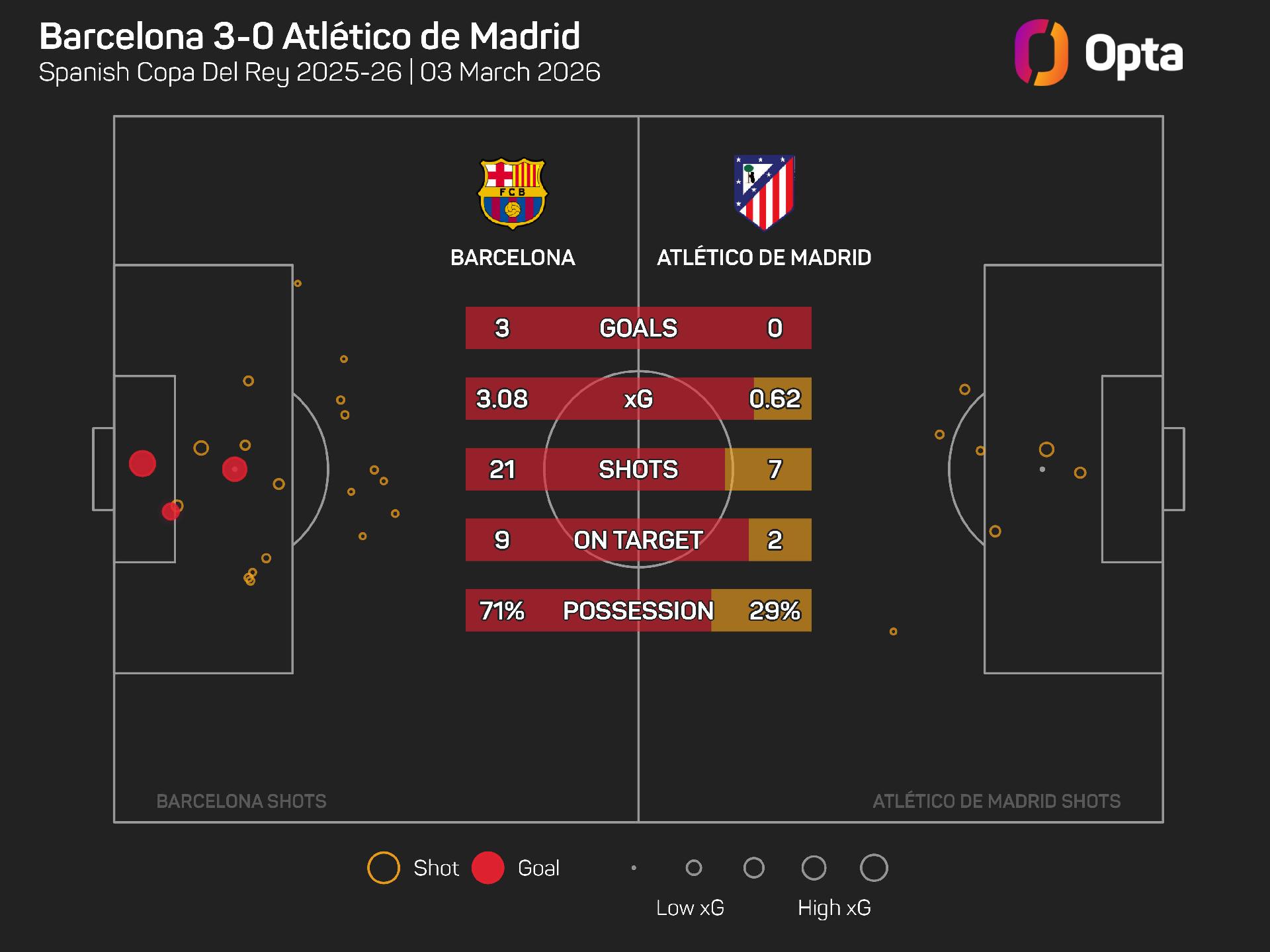 Barca were dominant throughout, having 21 shots worth 3.1 expected goals (xG), with nine of those hitting the target and another clipping the crossbar in the second minute.