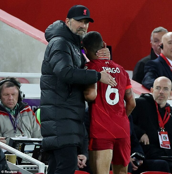 Thiago left the pitch to a standing ovation when he was substituted and wrapped in a bear hug by Jurgen Klopp.