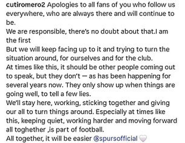 Romero posted on his Instagram account after defeat at Bournemouth, on Wednesday, a night when his defensive partner and vice-captain Micky van de Ven also became embroiled in angry post-match verbal exchange with fans in the away end.