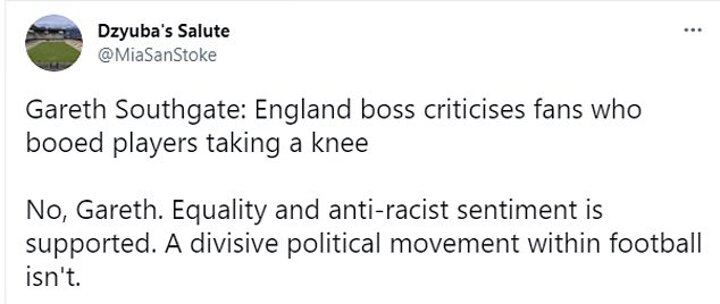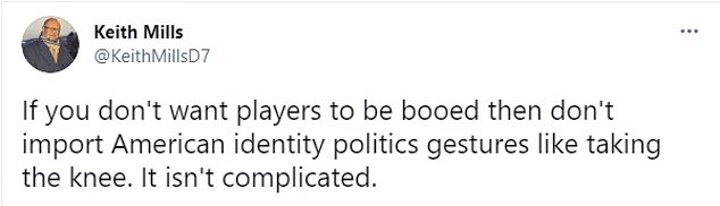 Another added: 'The boos are not in support of racism, but in the act of taking the knee, which has become a political statement. Political statements have no place in sport.'