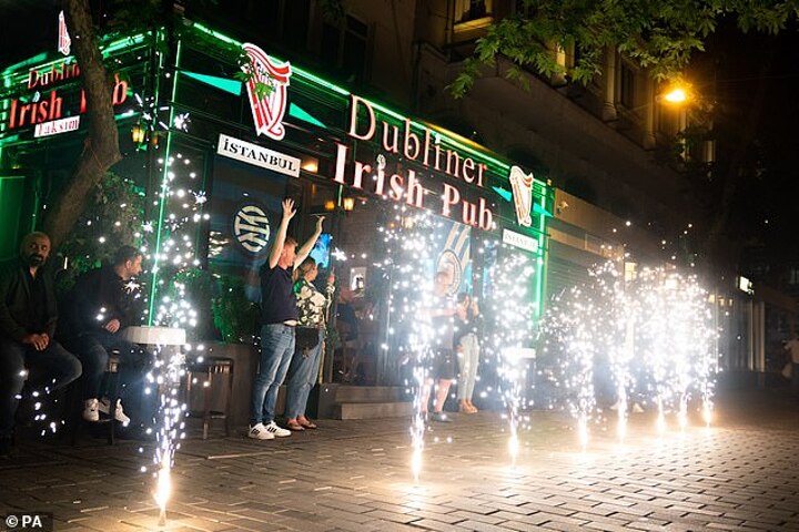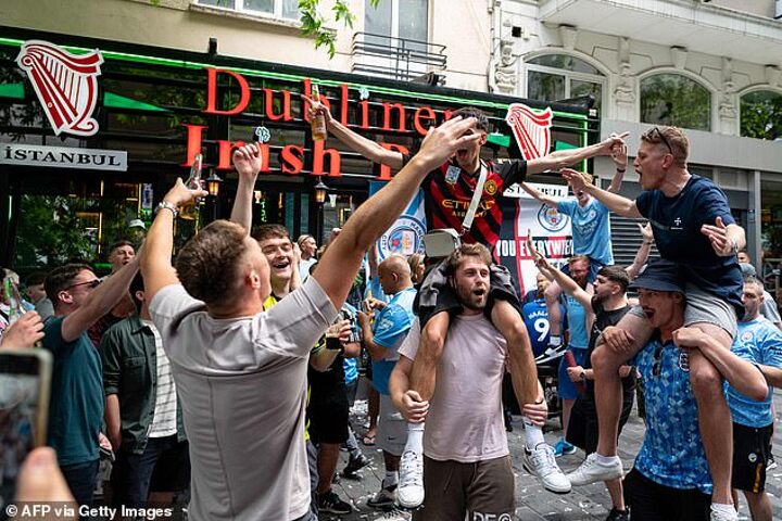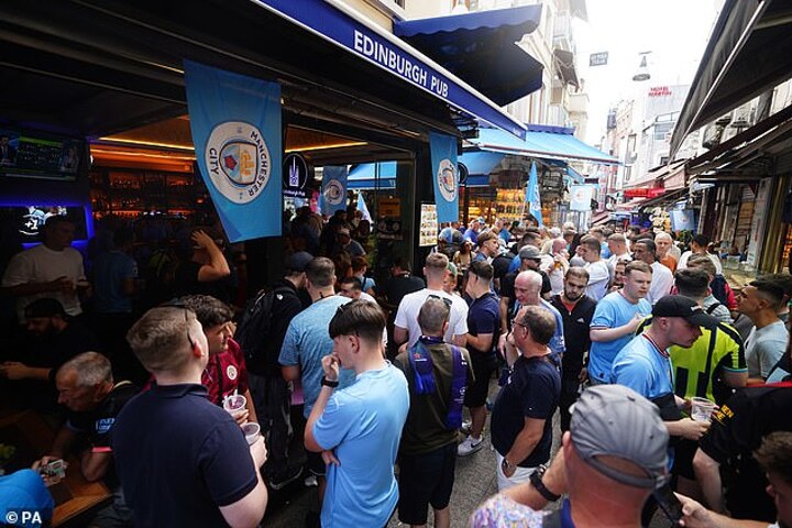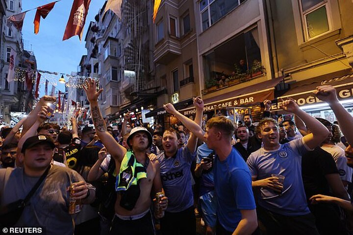 Once in the city many headed for the bars around Istanbul's famous Taksim Square where a pint of beer costs just £1.30 and by lunchtime the party was well underway as supporters sang and chanted for manager Pep Guardiola and his team.